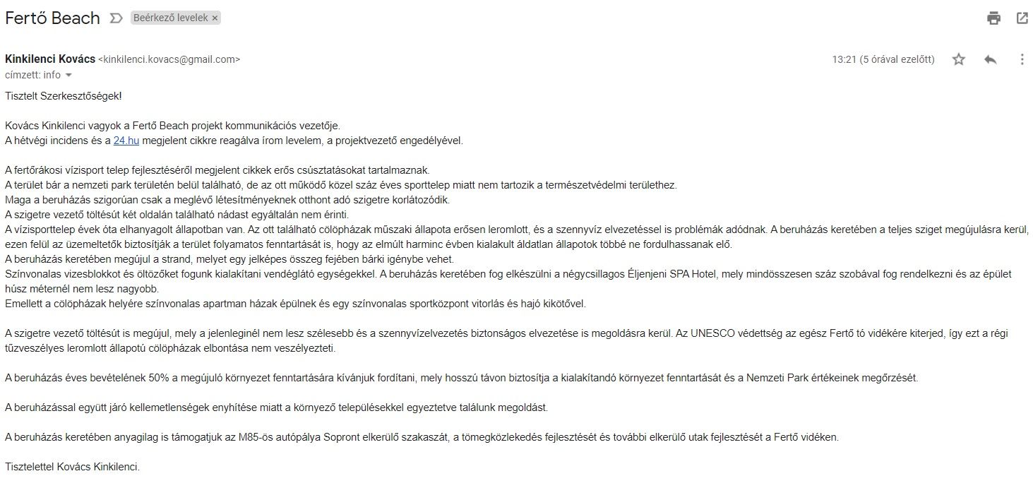 Csak úgy sorjáztak a közösségi médiában a megosztások a 24.hu Fertő tóval foglalkozó legújabb cikke nyomán, amely ugyan terjedelmes és valóban tartalmas is – legalábbis jó hosszú – de olyan nagyon sok újdonságot nem tartalmaz azoknak, akik már jó ideje követik a projekt eseményeit akár beruházáspárti, akár pedig ellenzői oldalon. Megy a szokásos pro és kontra. Azonban vannak olyanok, akik nem értenek egyet az említett cikk tartalmával és ennek igyekeznek is hangot adni és szerkesztőségeket értesítve a saját gondolataikat velük megosztani. Legalábbis erre enged következtetni egy hozzánk is eljuttatott levél, amelynek szerzője magát bennfentesként promotálja, bár egy kicsit kutakodva a világhálón gyorsan rá lehetett jönni, hogy igazából egy amolyan troll a szerzője ( mondjuk már a neve is erre engedett következtetni ) vagy ha úgy tetszik kamuprofilos, aki nagy valószínűséggel a jobboldali nézőpontokat preferálja elsősorban, ami persze nem baj, hiszen ez mindenkinek a szíve-joga. No persze azért kicsit kutakodtunk még és gyorsan sikerült arra is visszaigazolást kapnunk, hogy a beruházást kezelő Sopron-Fertő Turisztikai Fejlesztő Nonprofit Zrt. állományában sem szerepel olyan nevű kommunikációs vezető aki a levelet jegyzi, az általa Fertő Beach nevű projekt meg aztán végképp nem. ( Bár ezt nem kellett kutatni