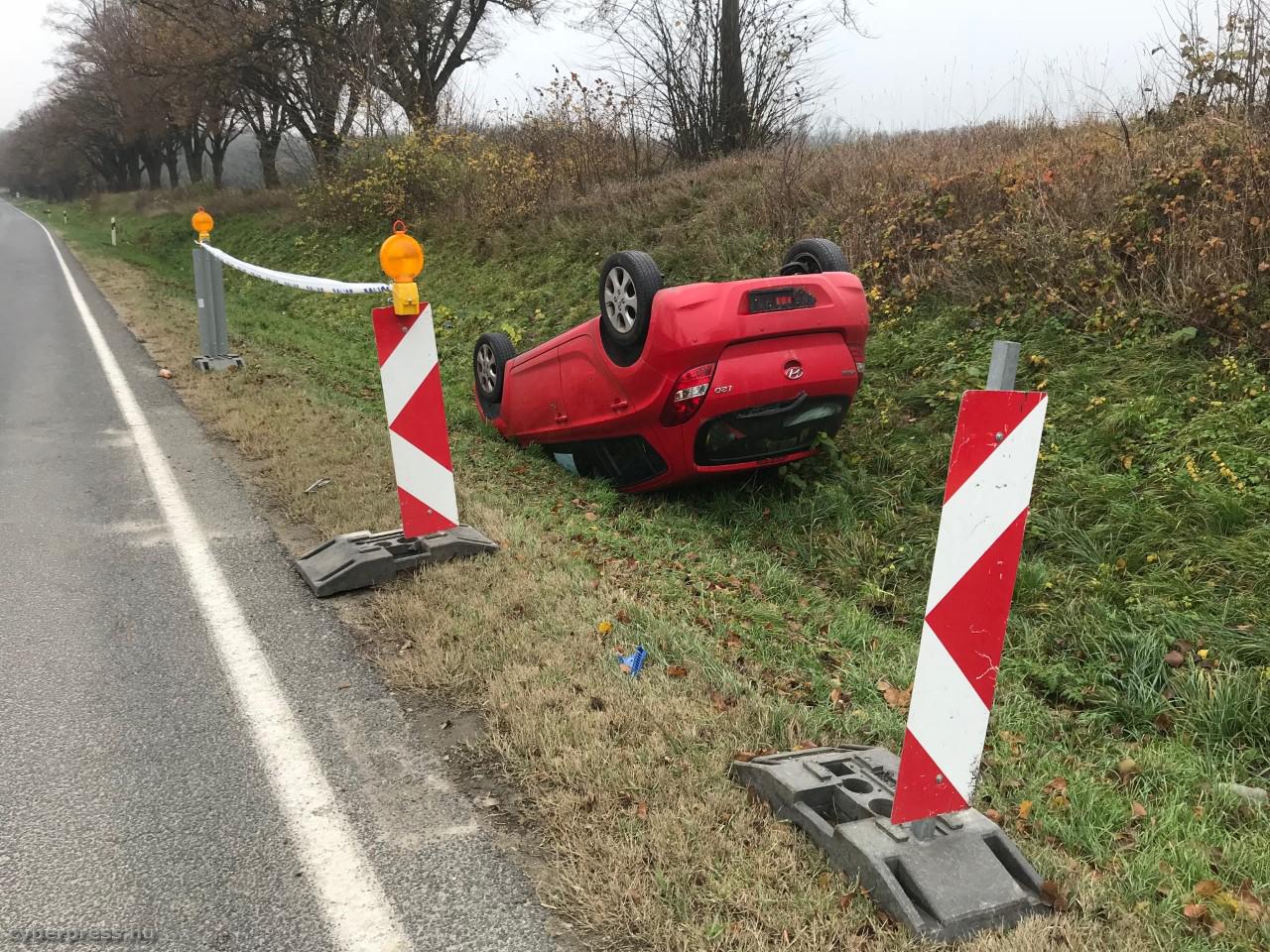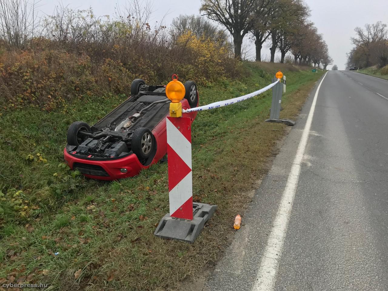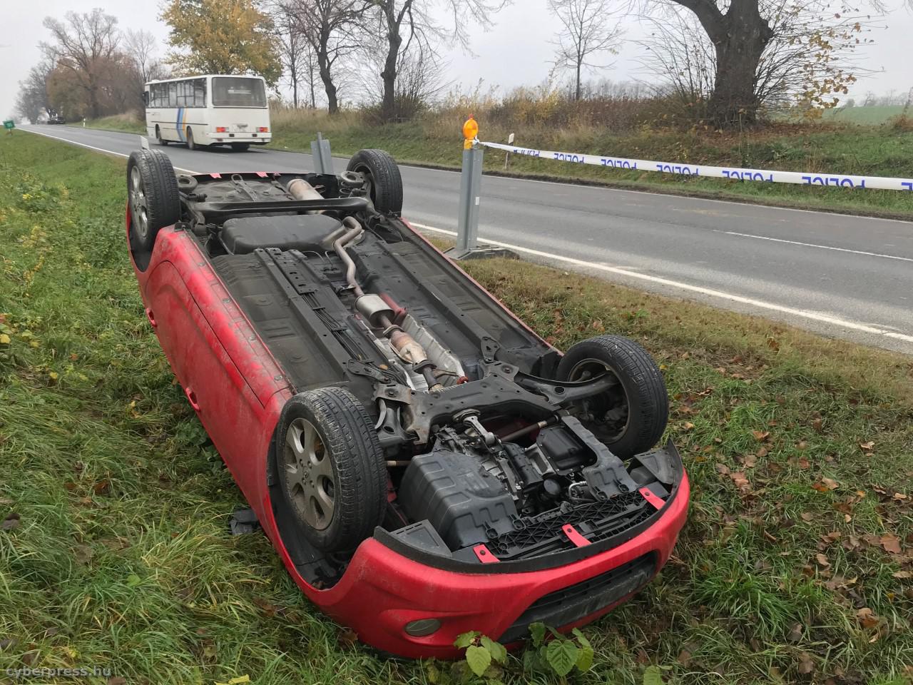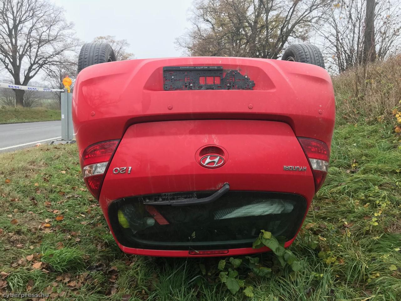A tetőre borult Hyundai i20 így már egy szerencsétlen közlekedési baleset elszenvedőjének tűnhet, ami bizonyára félrevezetheti az arra közlekedőket. Az úton közlekedők veszélyhelyzete mindenesetre ezzel a manőverrel elhárult, s már csak a rendőrségi szalag és a terelőoszlopok árválkodnak az út partján.