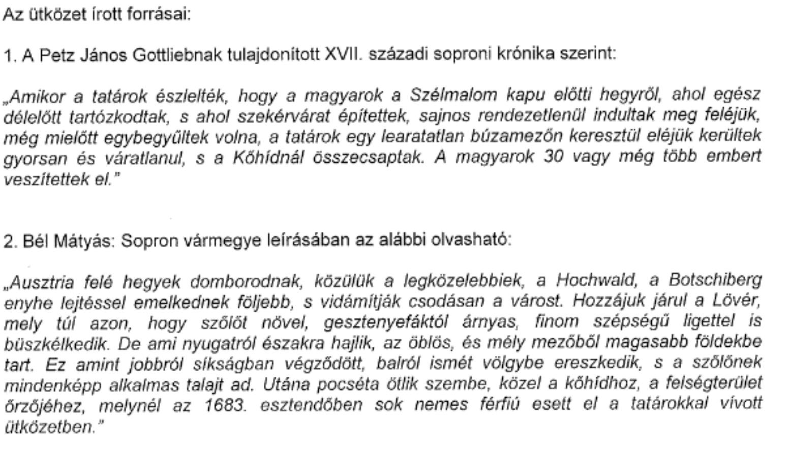 Az 1683-as kőhídi ütközet leírása Petz János Gottliebnak tulajdonított XVII. sz-i soproni kórnika szerint, illetve Bél Mátyás: Sopron vármegye leírásában / Forrás: sopron.hu