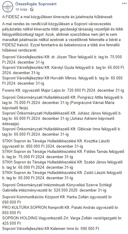 - Soproni Városfejlesztési Kft. / Ügyvezető: Kelemen Imre – Bruttó 690.000 Ft/hó.