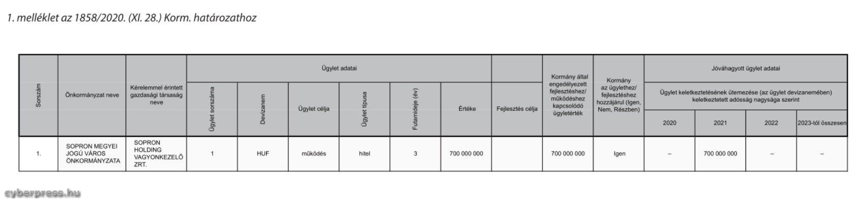A kormányzati szektorba nem sorolt, 100%-os önkormányzati tulajdonban álló gazdasági társaságok adósságot keletkeztető ügyleteihez történő 2020. július-augusztusi előzetes kormányzati hozzájárulásról szóló határozat csak a Sopron Megyei Jogú Város Önkormányzata által tulajdonolt gazdasági társaság kapcsán döntött. E mellett több város pedig fejlesztésekre tervez hitelt felvenni, hiszen ugyanezen közlönyben Bogács, Fehérgyarmat, Gyöngyöshalász, Hajdúnánás, Komárom és Nyírbátor kérelmét fogadta el a kormány, míg Kecskemét városa önmaga mintegy 6,5 milliárd forintos fejlesztési hitelt felvételét kezdeményezte pozitív elbírálás mellett.