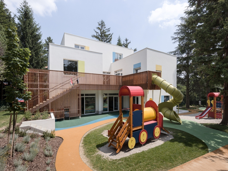 A projekt kivitelezése során feladat volt, hogy a telken lévő régi épület elbontása után a gyermekek igényeit teljes mértékben kielégítő, a kor színvonalának megfelelő létesítmény kerüljön kialakításra. A patinás, hangulatos, zöld övezetben, kis utcák között elhelyezkedő épület három szintjén és a kertben meglegyen minden ahhoz, hogy a gyerekek örömmel járjanak majd ebbe az óvodába, és a szülők is szívesen hozzák majd őket. A modern stílusjegyekkel megvalósult épületet a szűk helyen csak ötletes technikai megoldásokkal, kreatív hozzáállással és a résztvevők szoros együttműködésével sikerülhetett határidőre megépíteni. – írja a magyarépitok.hu.