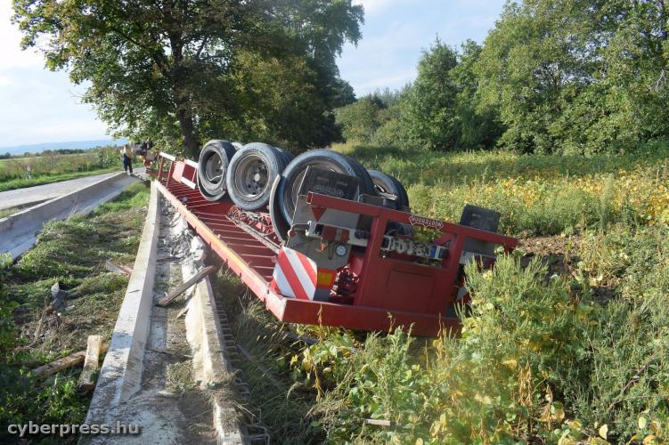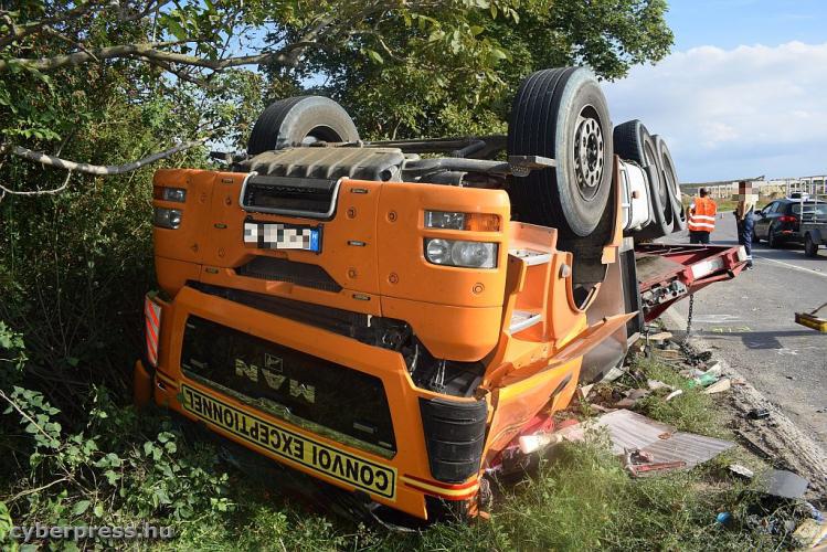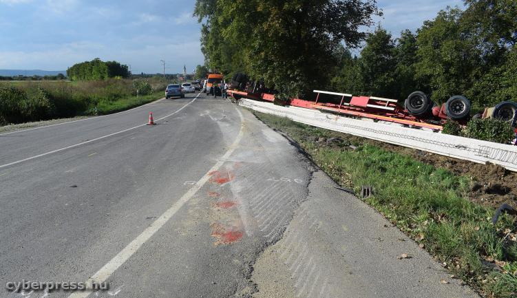 A jelenleg rendelkezésre álló adatok alapján, a járműszerelvényt vezető 45 éves sofőr nem a rakománynak megfelelően választotta meg sebességét, és egy balra ívelő kanyarban a pótkocsija kisodródott, majd a jármű az oldalára billent. Ezt követően egy fának ütközve, a tetejére fordulva állt meg. A rakományként szállított két, egyenként 16 tonnás beton hídgerenda az ütközés következtében a pótkocsiról levált. A balesetben a sofőr megsérült, továbbá több terelő- és jelzőtábla is megrongálódott. Az ügy vizsgálatát a Soproni Rendőrkapitányság szakértő bevonásával folytatja.