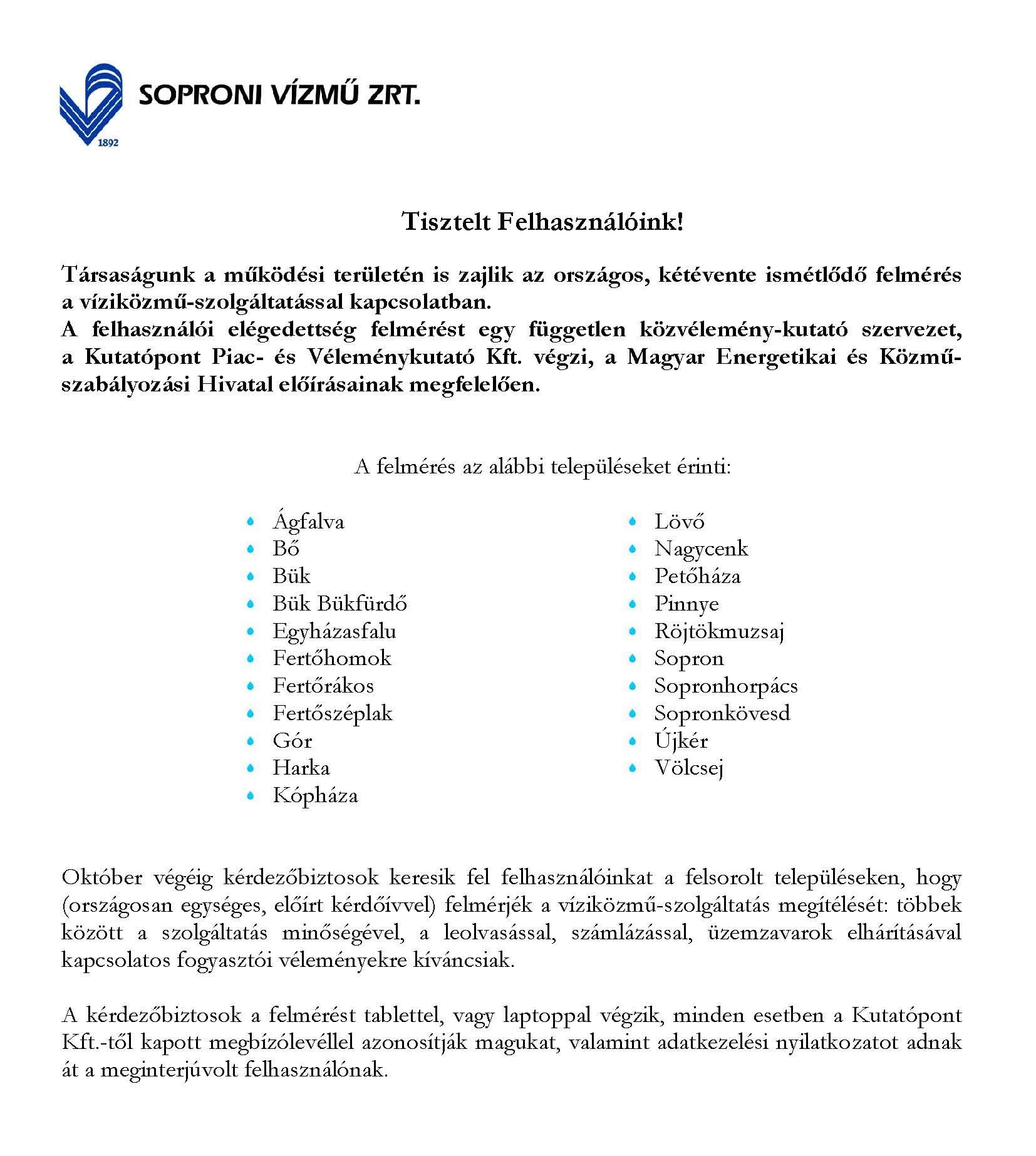 A Soproni Vízmű Zrt. tájékoztatja az ügyfeleit, hogy 2020. október 5-től személyes ügyfélszolgálataik kizárólag előzetes időpontfoglalás mellett vehetők igénybe, valamint ezeken a helyeken kötelező a szájmaszk viselése.