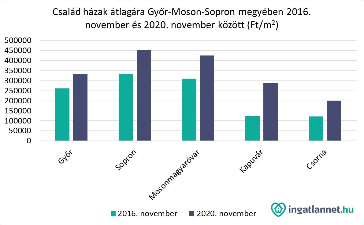 Statisztikai adataik segítségével jobban szemügyre vették az elmúlt évek változásait. Most az öt legnagyobb lélekszámmal rendelkező település: Győr, Sopron, Mosonmagyaróvár, Kapuvár és Csorna ingatlanáraira fókuszálva. Fontos azonban leszögezni, hogy az ismertetett átlagárak minden esetben az áralku nélküli, azaz a kínálati árakat tükrözik.