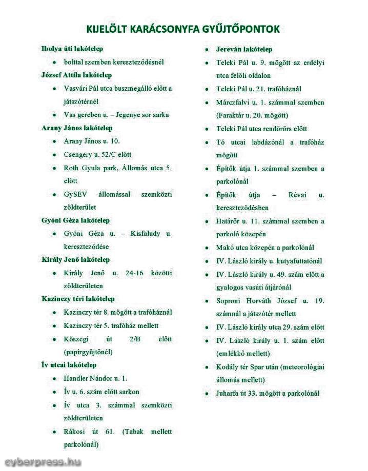Ebben az esztendőben is összegyűjti a Sopron Holding Zrt. a karácsonyi fenyőket azokról a lakótelepekről melyeken zöldterületi munkákat is végeznek. A lakótelepeken kihelyezett „Karácsonyfa gyűjtőhely” táblákkal ellátott területekről a vállalat munkatársai már január elejétől folyamatosan gyűjtik a karácsonyi fenyőfákat, információink szerint egy hónapon keresztül. Mutatjuk a listát: