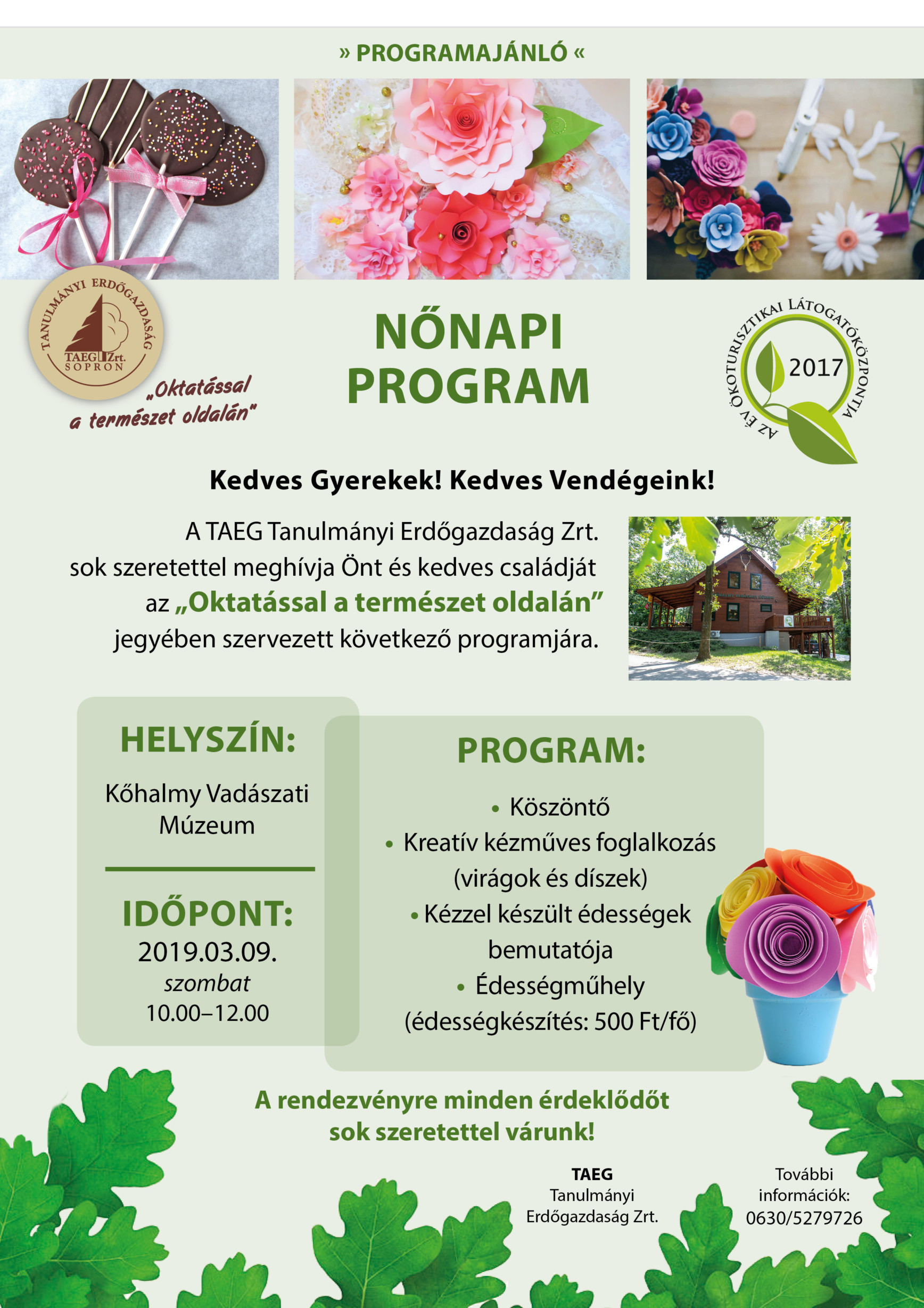 Ismét egy remek programot kínál az érdeklődőknek a TAEG Zrt. az ” Oktatással a természet oldalán” jegyében szervezett eseményén, amely ezúttal a Nőnap alkalmából került megrendezésre. A Kőhalmy Vadászati Múzeumban lesz kreatív kézműves foglalkozás és kézzel készült édességek bemutatója is, de lehetőség nyílik az Édességműhely nyújtotta lehetőség kipróbálására is. Sok szeretettel várnak minden érdeklődőt a szervezők!