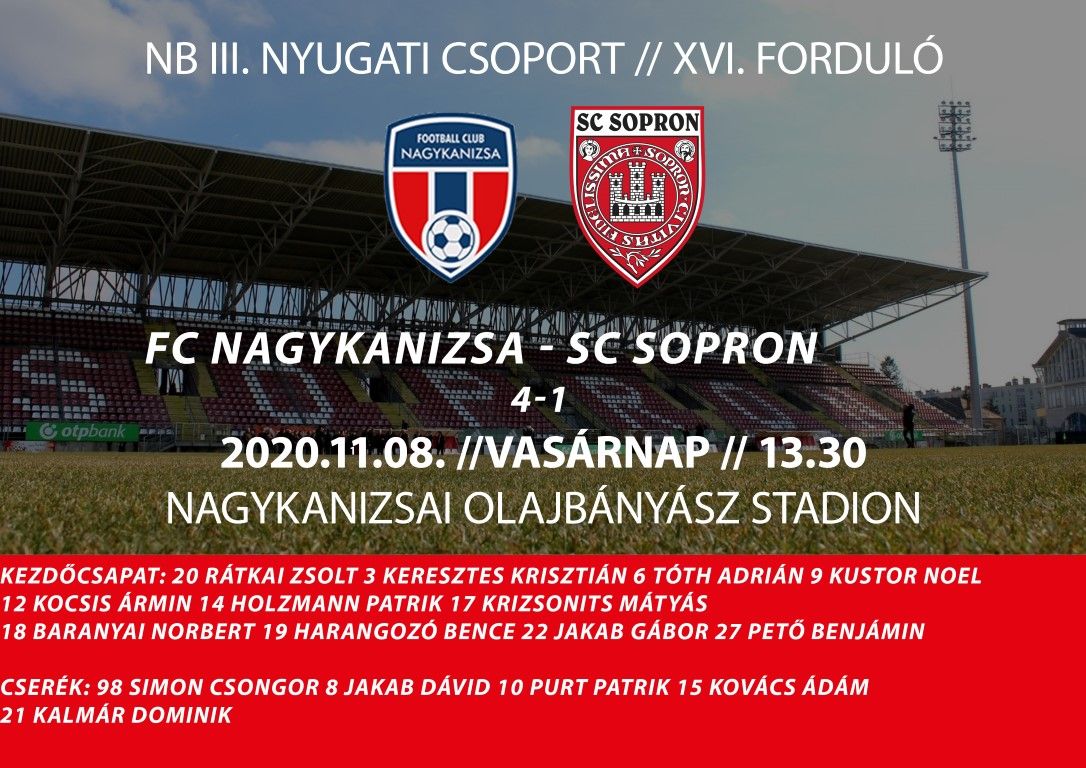 Az SC. SOPRON NB III. Nyugati csoportjának 16. fordulójában a Nagykanizsa otthonába utazott, amely mérkőzés soproni szempontból nem úgy alakult, ahogy jó lett volna, hiszen hiába szerezte meg az előnyt a leghűségesebb város csapata, nem sikerült azt megtartani.