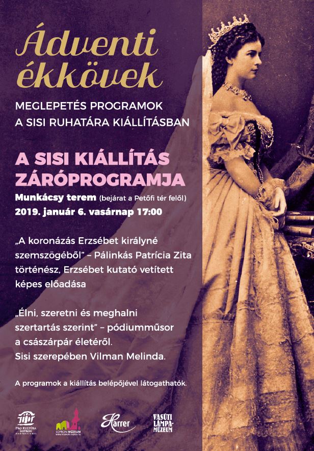 A tárlat záróestéjére is igazi meglepetéssel készülnek a szervezők. Vízkereszt napján, 2019. január 6-án délután 17:00 órától ismét Sopronban vendégeskedik a ruhákat megalkotó Czédly Mónika, és azok háttértörténetét felderítő Pálinkás Patrícia Zita történész. Ő a legismertebb magyarországi Erzsébet-kutató, aki ezúttal a koronázási ruha titokzatos történetéről, illetve magáról az 1867-es koronázásról tart vetített képes előadást – szigorúan Sisi szemszögéből. Az est második részében pedig egy különleges egyszemélyes színpadi játék, egy monodráma elevenedik meg a ruhák között, melynek témája a császárpár házasságáénak históriája. Erzsébet szerepében Vilman Melinda lép a soproni közönség elé.