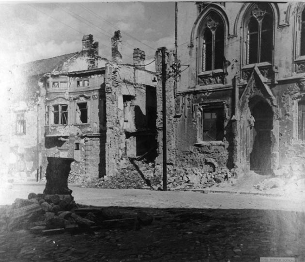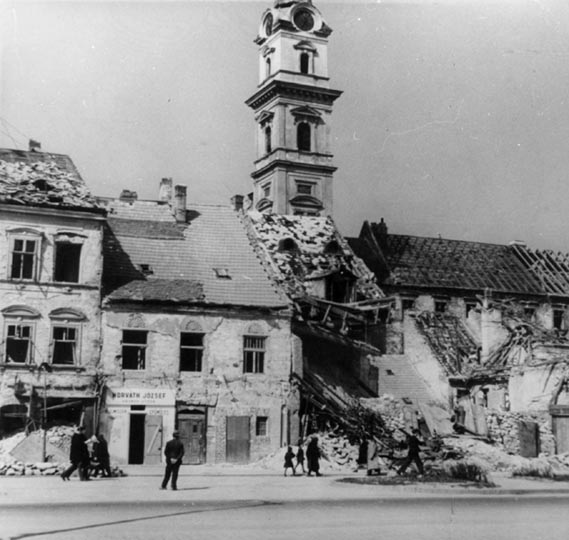 A városházát nem találták el, a neki szánt bombák a Szt. György utca 1., 2., 3., 4., 6. és 7. sz. házak egyes részeit döntötték romba. A pályaudvarokat azonban meglehetősen pontosan eltalálták. Ezeknek környékét úgyszólván teljesen elpusztították és mindazokat az épületeket is, amelyekben a megszálló német csapatoknak hadifontosságú raktáraik vagy megfigyelő állomásaik voltak.