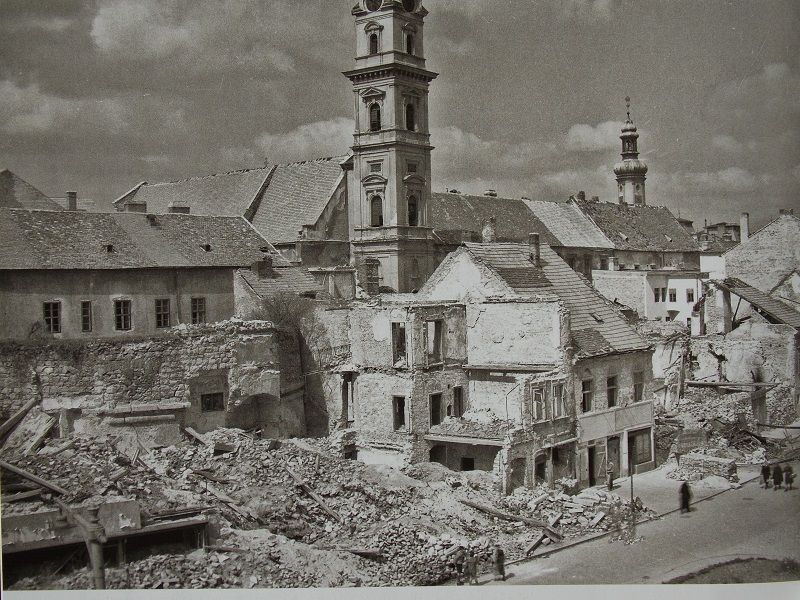 Légitámadás a város ellen. Aznap délelőtt fél 10-kor szólaltak meg a szirénák 11 óra körül kezdődött meg a bombázás, A folytonos repülőgépzúgásba furcsa sivító hang vegyült, hullani kezdtek a bombák. A Borsmonostori utcába hat bomba csapódott. A pályaudvarokra zuhant a legtöbb, 78 darab 500 és 1000 kilós bomba. A légitámadás kegyetlen vésővel átszabta a belvárost is. A Szent György utcában hét ház dőlt romba, eltűnt a Templom utcai zsinagóga, a Fegyvertár utca egyes épületeiből kémények meredtek az égnek. A Várkerület nyugati oldalán elpusztult házak mögül előbukkant a középkori nagy bástya íve. Az Orsolya tér súlyos károkat szenvedett, darabokra törött a tér közepén a Mária kút.