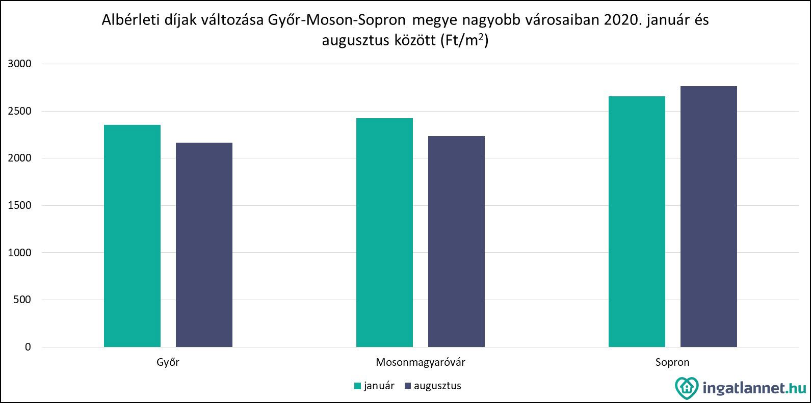 Az idei év kezdő díjaihoz képest két városban is olcsóbban bérelhetünk napjainkban ingatlant. Győrben és Mosonmagyaróváron ugyanis 8 százalékkal csökkentek a bérleti díjak 2020 januárjáról augusztusára. Sopronban azonban drágulás volt megfigyelhető a nyolc hónap során, hiszen 2657-ről 2764-re emelkedett a kiadó lakások bérlésének havi összege.