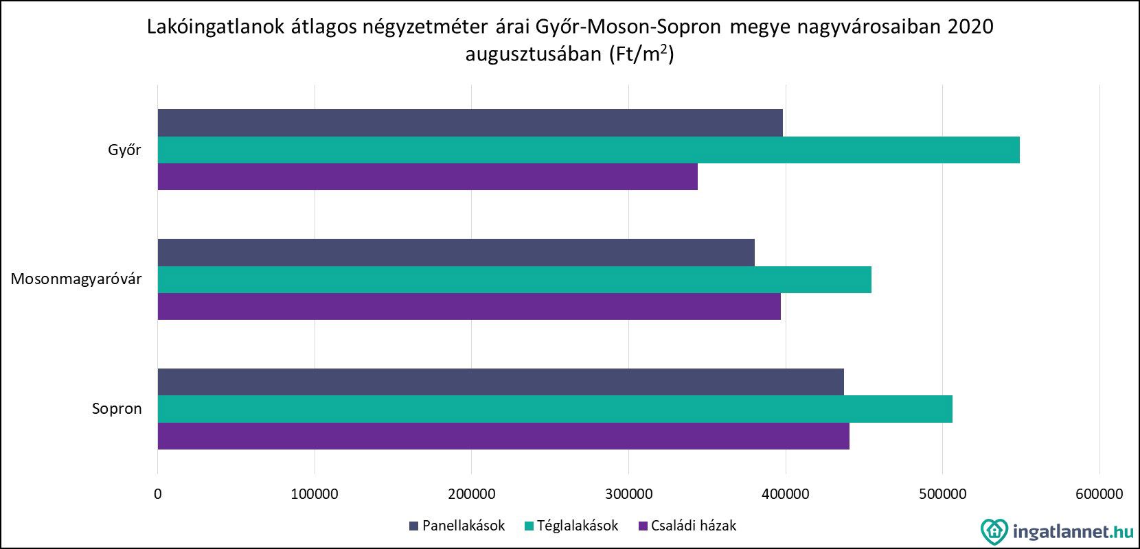 A győri családi házak ennek ellenére a legolcsóbbnak bizonyultak a nyár végén, hiszen azokat 344 ezer Ft/m2-es átlagáron hirdették. A sorban a mosonmagyaróvári házak következtek, 396 ezer Ft/m2-es árfekvéssel, majd a tabella élén Sopron helyezkedhetett el, mivel itt négyzetméterenként a 440 ezer forintot is elérte a házak kínálati ára.